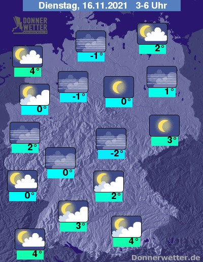 In der kommenden Nacht halten sich über dem Süden des Landes noch meist viele und teils dichte Wolken. Im übrigen Bundesgebiet zeigt sich der Himmel verbreitet nur gering bewölkt oder sternenklar, dazu bleibt es trocken. Es bildet sich stellenweise Nebel, dabei besteht die Gefahr von Reifglätte! Die Temperatur sinkt auf 4 Grad im Breisgau und bis -2 Grad im Grabfeld.
