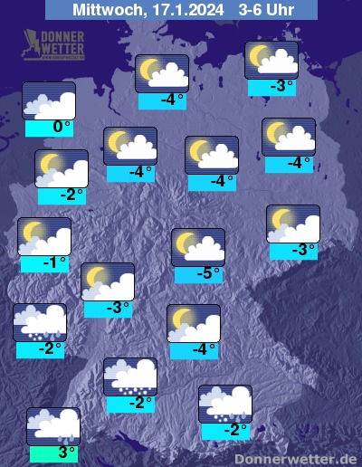 Die Temperaturen gehen in den frühen Morgenstunden zurück auf Werte um -5 Grad im Thüringer Becken und 3 Grad am Oberrhein.