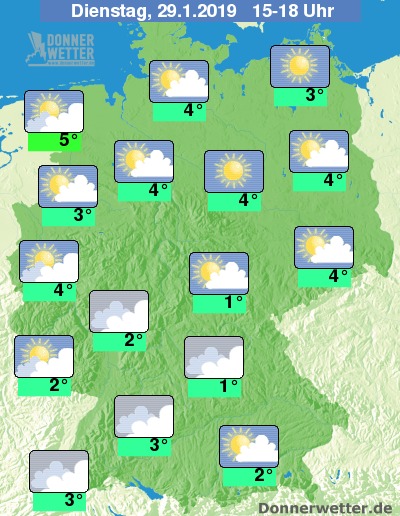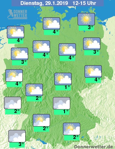 Die Temperaturen erreichen Höchstwerte um 1 Grad C im Thüringer Wald und um 5 Grad C an der Nordseeküste.