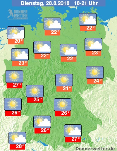 Vor allem im Norden halten sich noch einige Wolkenfelder, sonst strahlt verbreitet die Abendsonne. Dazu gibt es im Norden und Osten angenehme 20 bis 24, im Süden und Westen sommerliche 25 bis 28 Grad.