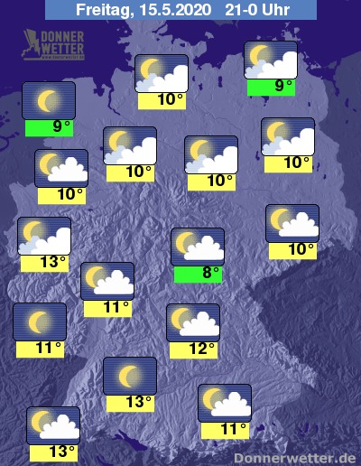 Die Temperaturen liegen am frühen Abend zwischen kühlen 11 Grad an der Emsmündung und etwas wonnigeren 17 Grad an Rhein und Neckar.