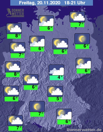 Der Abend gestaltet sich wechselnd bewölkt mit größeren Aufklarungsphasen. Lediglich in den Mittelgebirgen und an den Alpen halten sich die Wolken noch hartnäckiger. Es sollte jedoch allgemein trocken bleiben.