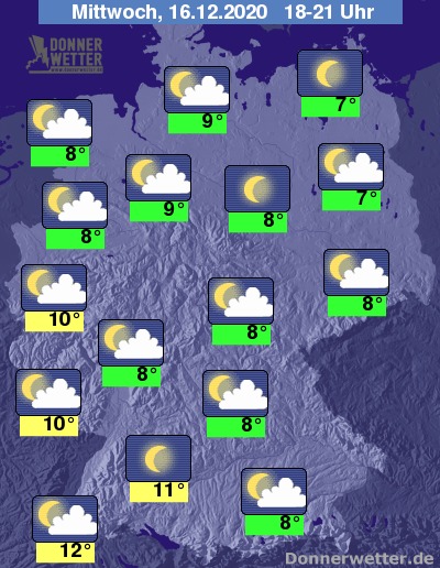 Die Temperaturen gehen von anfangs 7 bis 12 Grad bis Mitternacht auf 3 bis 8 Grad zurück.