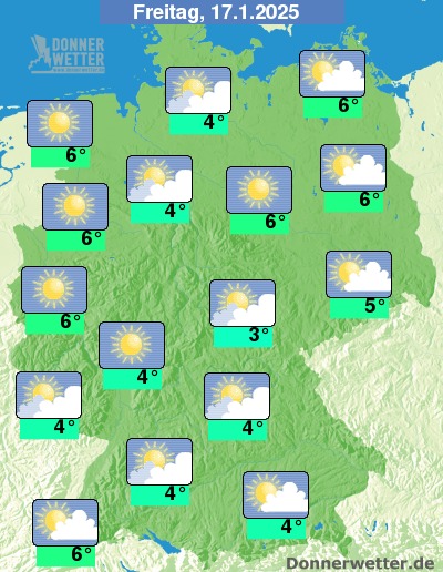 Am Freitag ist es über dem Norden oft bewölkt, es bleibt aber meist trocken. In den übrigen Landesteilen zeigt sich der Himmel nach Nebelauflösung heiter oder es ist sonnig, in einigen Niederungen bleibt es am Freitag aber auch ganztägig neblig-trüb.