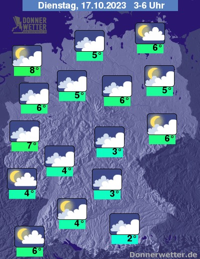 In der kommenden Nacht ziehen oft dichte Wolken durch, gebietsweise lockert es aber auch auf, dazu bleibt es trocken. Die Temperatur sinkt auf 8 Grad in Wilhelmshaven und 2 Grad in Augsburg.