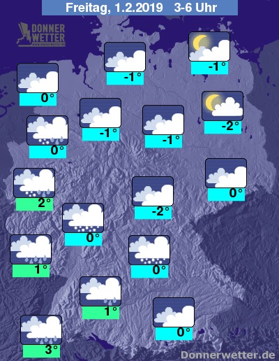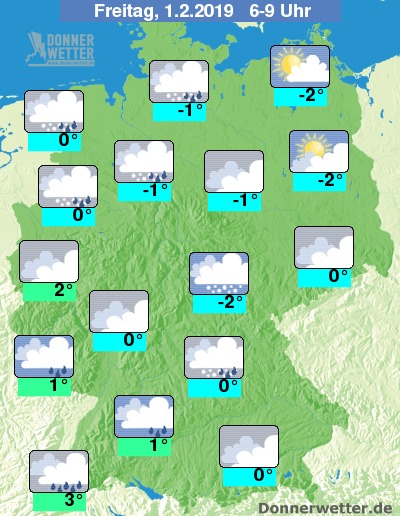 Im Süden und Westen bleibt der Himmel meist bedeckt und verbreitet muss mit Niederschlägen gerechnet werden, die als Regen, Schneeregen oder Schnee fallen können. Örtlich droht erhebliche Straßenglätte!