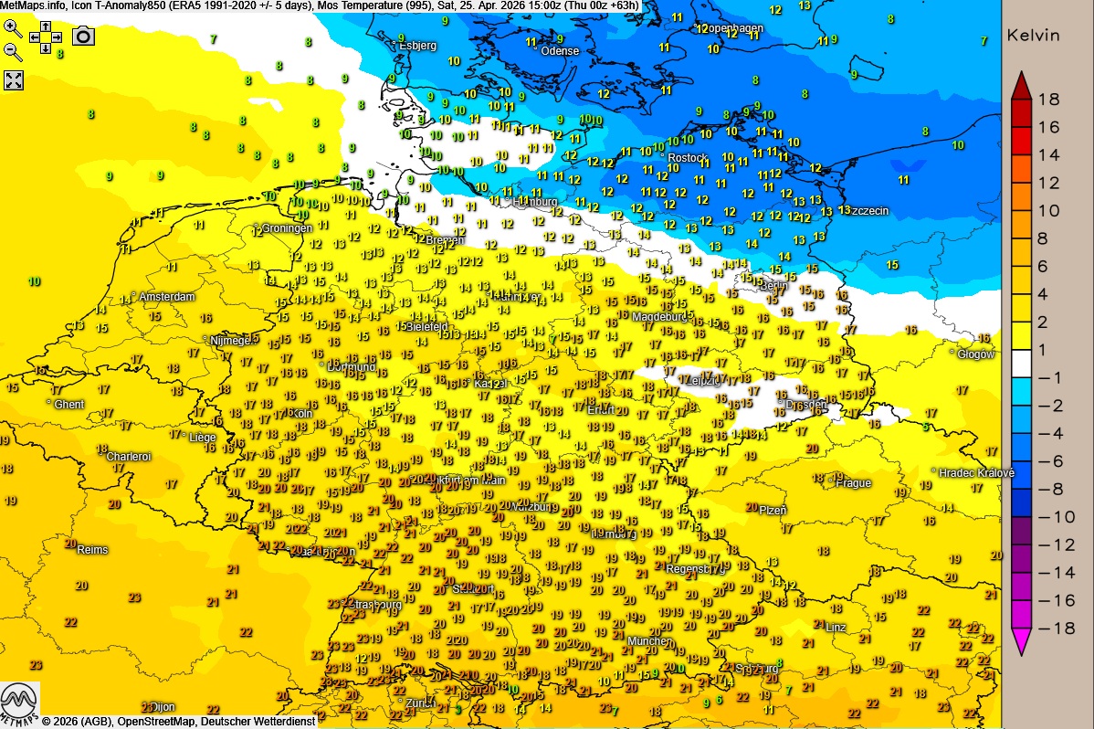 Lufttemperaturen und Temperaturanomalie am Samstagnachmittag (15:00 Uhr) nach ICON