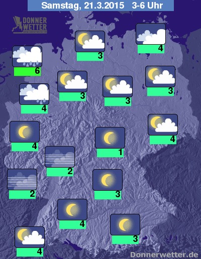In der folgenden Nacht bleibt es in der Mitte und im Süden oft sternenklar, stellenweise bildet sich jedoch Nebel oder Hochnebel, dazu bleibt es trocken. Im Nordwesten ziehen dagegen dichte Wolken und zeitweiliger Regen auf, der bis zum Morgen etwa eine Linie Rheinland - südliches Niedersachsen - Rügen erreicht. Im Osten Deutschlands ist es locker bis aufgelockert bewölkt und es bleibt trocken. Die Temperatur sinkt auf 6 Grad an der Nordsee und bis 1 Grad im Grabfeld.