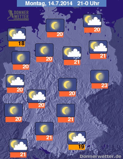 Am Abend bilden sich besonders vom Alpenrand bis zum Bayerischen Wald weitere Schauer und Gewitter, sonst lassen Schauer und Gewitter aber verbreitet nach und die Bewölkung lockert auf, häufig wird es auch sternenklar. Die Abendwerte liegen bei 23 Grad in Dresden und etwa 18 Grad in Emden.