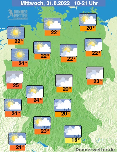 In den Abendstunden kommen die Regengebiete im Süden weiter östlich voran, bis Mitternacht ist dann vor allem noch am Alpenrand mit Niederschlägen zu rechnen. Im Norden bleibt es bei geringer, im Nordosten anfangs auch noch aufgelockerer Bewölkung, trocken.