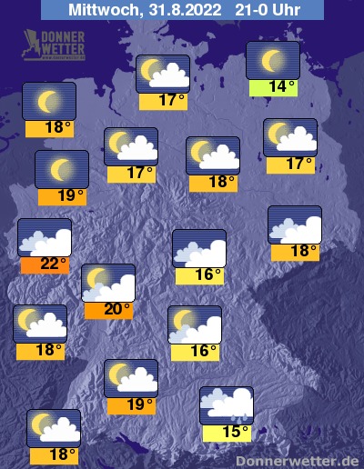Die Temperaturen sinken bis Mitternacht auf Werte um 22 Grad in Köln und 14 Grad an der Ostseeküste.
