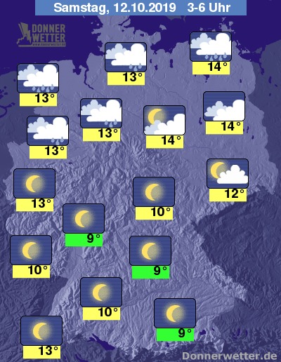 In der Nacht zeigt sich der Himmel über dem Norden des Landes verbreitet stark bewölkt oder bedeckt und vor allem an den Küsten und im Nordwesten muss zeitweise mit Schauern gerechnet werden. In der Mitte ist es anfangs noch locker oder aufgelockert bewölkt, später klart der Himmel im Süden weitgehend auf.