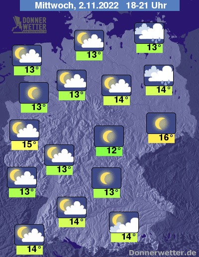 Heute Abend sind von Berlin-Brandenburg bis nach Vorpommern noch meist dichte Wolken mit einzelnen Schauern unterwegs, im übrigen Norden ist es bereits verbreitet locker bewölkt und trocken. Im übrigen Land ist es weitgehend locker bewölkt bis sternenklar und ebenfalls trocken. Die Temperatur liegt bei 12 Grad in Jena und etwa 16 Grad in Dresden. An der Ostsee ist es teils stürmisch, an der Nordsee herrscht teils Sturm.