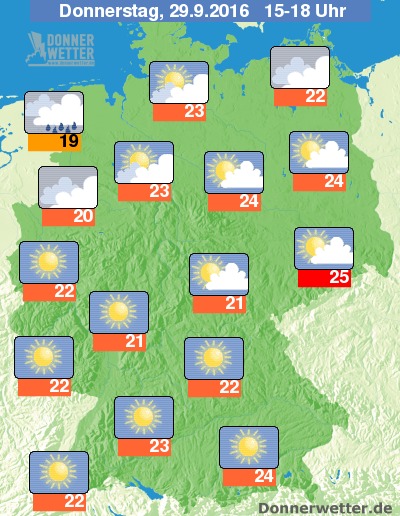 Die Temperaturen erreichen am Nachmittag Werte um 19 Grad C in Emden und um 25 Grad C in Dresden.