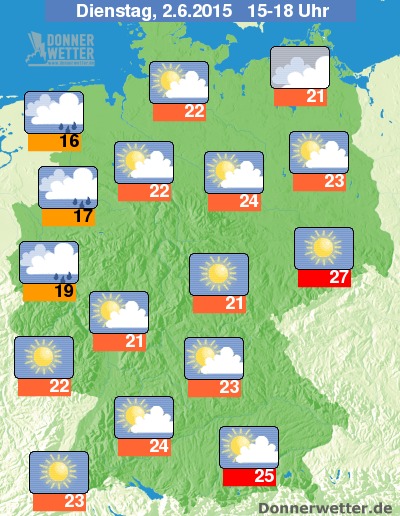 Am Dienstagmittag zeigt sich der Himmel über weiten Teilen des Landes heiter oder bewölkt, nur in der Westhälfte fallen noch örtliche Schauer. Die Temperaturen steigen auf Werte um 15 Grad C im Münsterland und bis 26 Grad C in der Sächsischen Schweiz.