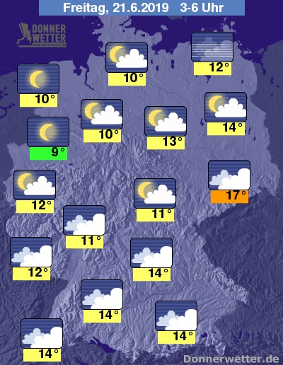In der Nacht auf Freitag zeigt sich der Himmel über weiten Teilen des Landes locker oder aufgelockert bewölkt, südlich der Donau und später auch in weiten Teilen Bayerns und Baden-Württembergs bleibt der Himmel häufig bedeckt. Im westlichen Brandenburg sowie in Berlin können anfangs einzelne Schauer fallen, meist bleibt es in der Nacht aber trocken.