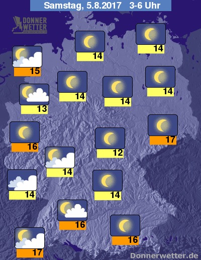 In der Nacht zum Samstag klingen letzte Schauer oder Gewitter auch am Alpenrand ab und es lockert oder klart hier genauso auf wie im übrigen Land. In der zweiten Nachthälfte ziehen im Südwesten und später auch im Westen dichte Wolken auf, die für etwas Regen sorgen können, sonst bleibt es aber trocken. Die Temperatur sinkt auf 17 bis 12 Grad.
