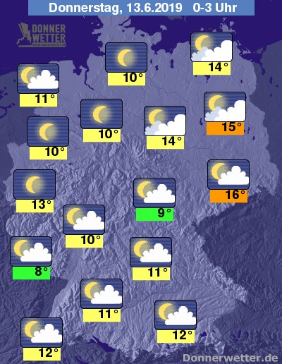 In der Nacht zeigt sich der Himmel zunächst noch häufig locker oder aufgelockert bewölkt, im Nordwesten sowie entlang des Rheins funkeln die Sterne anfangs auch noch von einem sternenklaren Himmel. Im weiteren Nachtverlauf nimmt die Bewölkung dann vor allem im Süden und Osten Deutschlands zu, zwischen Harz und dem Altmühltal können zudem zeitweise Schauer fallen. Sonst bleibt es meist trocken.