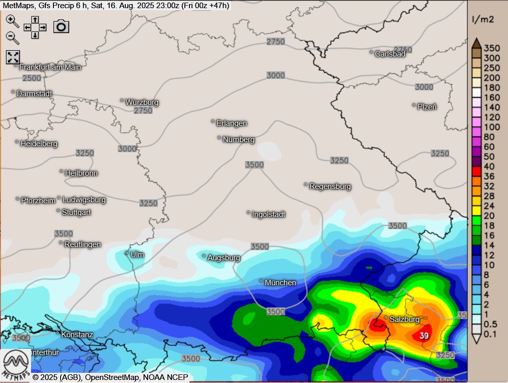 Die Karten bilden die Temperaturen (17:00 Uhr) sowie die Sechs-Stunden-Regenmengen für Bayern (bis 23:00 Uhr) nach GFS ab.