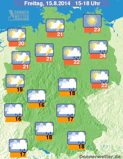 Heute Nachmittag kann es unter zum Teil dichten Quellwolken fast überall zu Schauern und Gewittern kommen. Trocken bei mehr Sonnenschein bleibt es dagegen im Bereich des Ostseeumfelds. Die Temperatur liegt bei nur kühlen 16 Grad im Pfälzer Wald und warmen 24 Grad in Berlin.