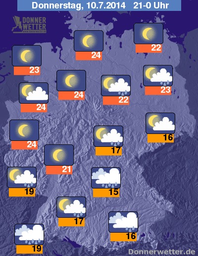Am Abend bleibt es im Norden und Westen bei aufgelockerter Bewölkung überwiegend trocken, im Osten, vor allem aber im Süden ziehen auch häufig dichte Wolken durch, die zu einzelnen Schauern führen können. Die Abendwerte liegen bei 24 Grad in Bremen und 15 Grad in der Fränkischen Schweiz.