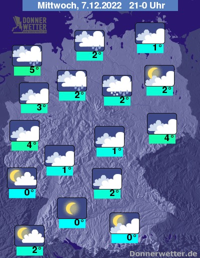 Die Temperaturen gehen bis Mitternacht auf Werte um 5 Grad in Ostfriesland und 0 Grad am Alpenrand zurück.