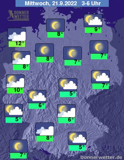 In der Nacht zum Mittwoch halten sich im Nordseeumfeld oft dichte Wolken, auch im Süden ist es hier und da stark bewölkt. Im übrigen Bundesgebiet zeigt sich der Himmel verbreitet locker bewölkt, vor allem im Norden und Osten oft sternenklar. Es bleibt landesweit trocken bei Tiefstwerten von 12 Grad in Wilhelmshaven und 5 Grad in Erfurt.