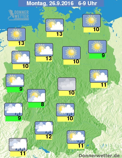 Der Montagmorgen bringt der Nordhälfte einen trockenen Sonne-Wolken-Mix, vor allem zwischen Elbe und Oder zeigt sich vielfach ungestört die Sonne. Weiter südlich nimmt die Bewölkung dann zu, in weiten Teilen Bayern und Baden-Württembergs muss mit Schauern gerechnet werden.