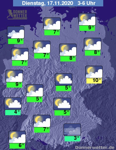 In der Nacht auf Dienstag bleibt die Wolkendecke an Weser und Elbe sowie im Südosten Detuschlands zunächst noch geschlossen, bevor in den frühen Morgenstunden wie in den übrigen Landesteilen ein Mix aus lockerer oder aufgelockerter Bewölkung überwiegt. Im Südosten kann es dabei zunächst noch vereinzelt tröpfeln, sonst bleibt es häufig trocken.