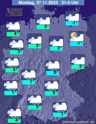 In der Nacht auf Dienstag ist der Himmel über weiten Landesteilen stark bewölkt oder bedeckt. In der Nord- und Osthälfte bleibt es meist niederschlagsfrei, in den übrigen Landesteilen sind in den nächsten Stunden immer wieder Regen-, Schneeregen- oder Schneeschauer möglich.
