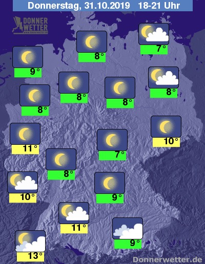 Am Abend halten sich südlich der Donau noch kompaktere Wolken, Regen fällt daraus jedoch kaum noch. In den anderen Gebieten präsentiert sich der Himmel größtenteils klar oder nur leicht bewölkt.