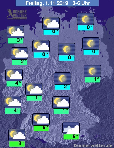Bis zu den Frühstunden kühlt die Luft auf 0 bis 5 Grad ab, unter der schützenden Wolkendecke ganz im Süden bleibt es genau wie im Markgräflerland mit 6 bis 8 Grad etwas milder. In den Gebieten wo die Sterne funkeln besteht Frost- und Reifgefahr. Stellenweise kann das Quecksilber unter -2 Grad sinken.