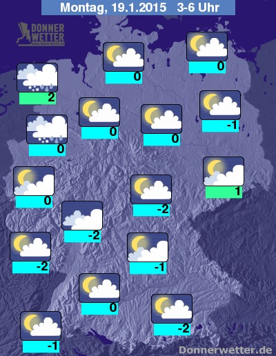 Am Montag ist es vor allem in der Osthälfte Deutschlands noch oft aufgelockert bewölkt, sonst und am Nachmittag auch nach Osten hin ist es jedoch überwiegend stark bewölkt. Bereits ab den Vormittagsstunden ziehen am Westrand der Republik Schnee, Schneeregen oder Regen auf, dazu kann es gefährlich glatt auf den Straßen werden, in der Osthälfte des Landes bleibt es dagegen weitgehend trocken. Die Temperatur steigt auf 1 Grad am Niederrhein und bis 6 Grad in Dresden.