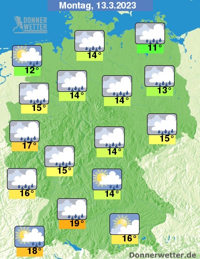 Am Montag ist es aufgelockert oder stark bewölkt, dabei fällt zunächst über der Nordosthälfte noch zeitweise Regen, während es sonst weitgehend trocken ist. Am Nachmittag ziehen dann jedoch von Westen her zum Teil kräftige Schauer auf. Örtlich bilden sich sogar Gewitter. Die Temperatur erreicht 11 Grad an der Ostsee und bis 19 Grad im Raum Stuttgart. Es weht dazu ein starker und oft auch stürmischer Wind.