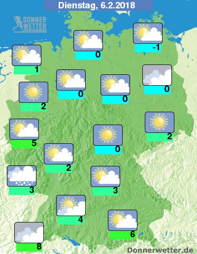 Am Dienstag scheint wieder in weiten Landesteilen die Sonne von einem teils wolkenlosen, teils wechselnd bewölktem Himmel. Dichte Wolken sind jedoch über dem Osten und vor allem im Südwesten des Landes möglich. Bis auf einzelne Flocken im Saarland bleibt es aber landesweit trocken. Die Temperatur erreicht lediglich -1 Grad an der Müritz und bis 8 Grad in Freiburg.