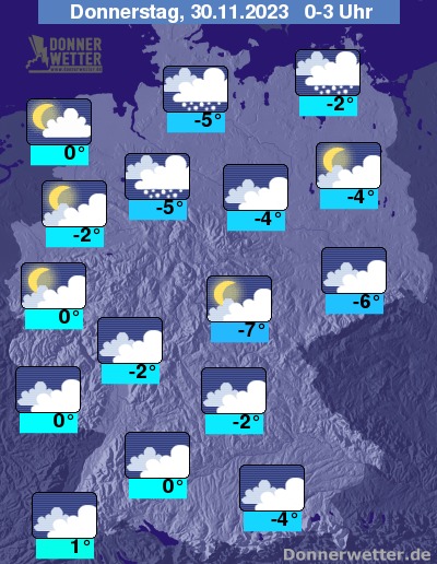 In der Nacht auf Donnerstag fallen im äußersten Norden und Nordosten weitere Schneeschauer, ansonst ziehen die Schauergebiete zunehmend ostwärts ab und es sind nur noch selten Niederschläge zu erwarten. In der Nordhälfte kann es in den frühen Morgenstunden dann auch größere Auflockerungen geben.