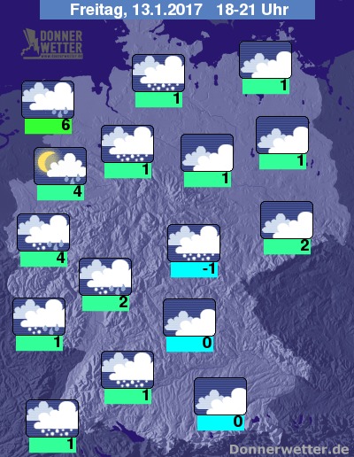 Am Abend schneit es vor allem in der Westhälfte weiter, während es im Osten auch mal längere Zeit trocken bleibt. Der Sturm flaut nun langsam etwas ab.