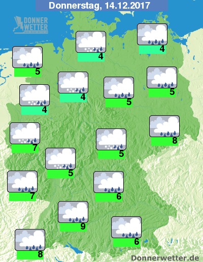 Am Donnerstag zeigt sich der Himmel überwiegend stark, nur hier und da auch mal etwas aufgelockert bewölkt, es fällt zeitweise Regen, Schneeregen und zum Teil auch Schnee. Die Temperatur steigt auf 4 bis 8 Grad.