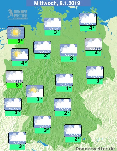 Abgesehen von kurzen Auflockerungen dominieren im größten Teil unseres Landes die Wolken. In der Osthälfte,sowie im Süden fällt zeitweise Niederschlag, der oberhalb etwa 300 m meist in Form von Schnee fällt, darunter teils als Schnee, teils als Regen. In Staulagen des Erzgebirges und der Alpen halten die Schneefälle auch längere Zeit an und sind weiterhin ziemlich kräftig. Es  besteht verbreitet Glätte auf Straßen und Gehwegen. Größtenteils trocken bleibt es im Nordwesten. Hier lässt sich auch für längere Zeit die Sonne blicken.