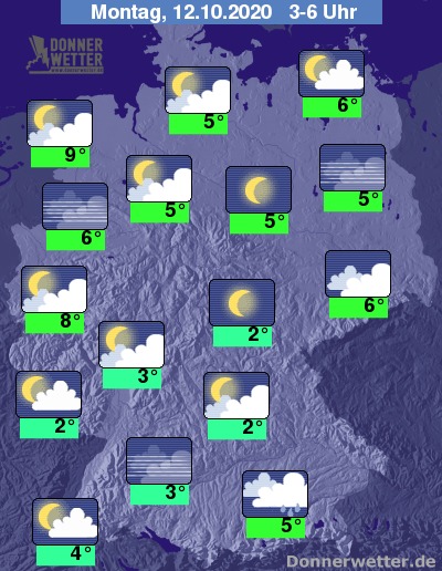 In der Nacht zum Montag zeigt sich der Himmel zum Großteil locker bewölkt oder sternenklar. Oft stark bewölkt ist es über Bayern, Sachsen und der Südosthälfte Brandenburgs. Regen fällt jedoch lediglich noch am Alpenrand. Die Temperatur sinkt auf 9 Grad an der Nordsee und bis etwa 2 Grad im Saargau. Stellenweise sind Nebel und Rauhreif möglich!