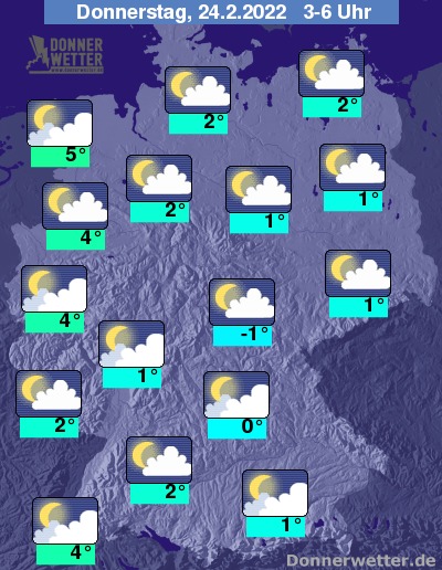 In der Nacht zum Donnerstag ist es anfangs noch oft locker bewölkt und teils sternenklar, von Westen her ziehen jedoch mehr und mehr und teils auch dichte Wolken heran, dazu bleibt es aber trocken. Die Temperatur sinkt auf 5 Grad in Emden und bis -1 Grad in Jena. An den Küsten weht weiterhin ein oft stürmischer Wind.