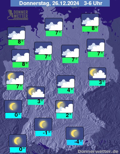Am 2. Weihnachtsfeiertag zeigt sich das Wetter im Süden verbreitet heiter bis sonnig, nördlich des Mains bleibt es hingegen zumeist trüb oder stark bewölkt, aber es kann auch etwas auflockern. Es bleibt trocken bei Höchstwerten von 4 Grad in Augsburg und bis 11 Grad in Emden.