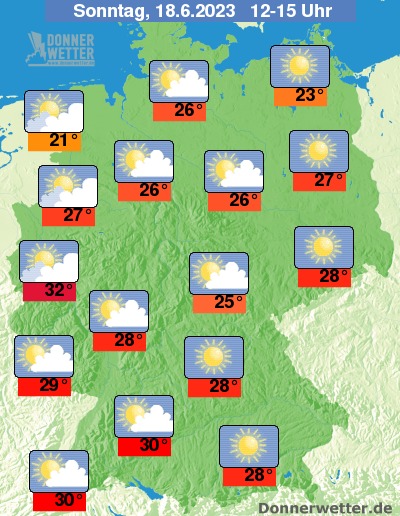 Heute Abend ist es noch oft heiter, vor allem im Osten und Nordosten auch sonnig. Besonders in den westlichen Landesteilen ziehen vielerorts auch dichte Quellwolken auf, dabei sind vereinzelte Schauer möglich, sonst bleibt es aber trocken. Die Temperatur liegt bei 23 Grad an den Küsten, sonst bei rund 26 Grad in Erfurt und bis zu 32 Grad in Köln.