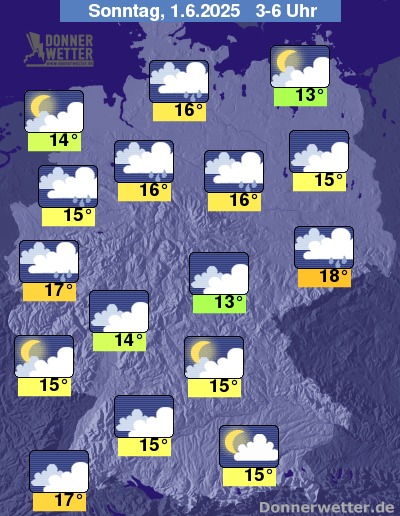 In der Nacht zum Sonntag hält sich zumeist starke Bewölkung, vor allem im Süden kann es hier und da auch auflockern, hier bleibt es meist trocken, sonst können sich weiterhin einzelne Schauer, aber nur noch selten Gewitter bilden. Die Tiefstwerte liegen bei 18 Grad in Dresden und etwa 13 Grad in Neubrandenburg.