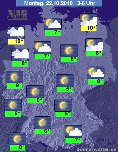 In der Nacht zum Montag zieht von der Nordsee her eine Kaltfront mit dichten Wolken und zeitweisem Regen in südöstliche Richtung. Über der Südosthälfte des Landes ist der Himmel die Nacht über meist sternenklar und es dazu bleibt es hier noch trocken. Die Temperatur sinkt auf 12 Grad an der Nordsee und bis 5 Grad in Mittelfranken.