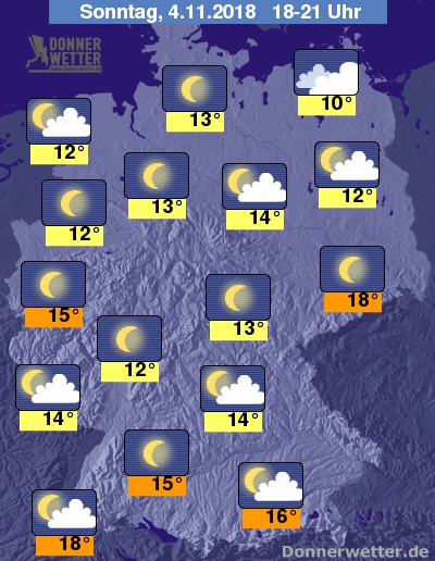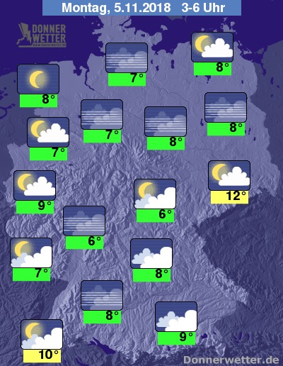In der Nacht zum Montag ist der Himmel über dem Süden teils stark, teils gering bewölkt, sonst ist es meist sternenklar oder es ziehen nur lockere Wolken durch. Es bleibt überall trocken bei Tiefstwerten zwischen 12 Grad in Dresden und bis 6 Grad am Westerwald.