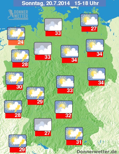 Heute Nachmittag zeigt sich in großen Teilen der Republik zwischen einigen Wolken auch immer wieder die Sonne, vor allem im äußeren Westen und Süden hält sich eine meist geschlossene Wolkendecke und hier kommt es auch immer wieder zu teils gewittrigen Regengüssen, sonst bleibt es im Land weitegehend trocken. Die Temperatur liegt bei schwülwarmen 24 Grad an der nördlichen Ems und tropischen 34 Grad im Raum Berlin-Brandenburg.