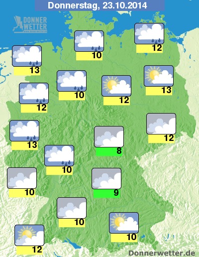 Auch am Donnerstag bleibt der Himmel verbreitet stark bewölkt und die Sonne kann sich nur gebietsweise mal zeigen. Es fällt zeitweise Regen und die Temperatur steigt auf herbstliche 8 bis 13 Grad.