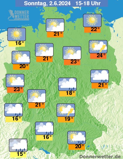 Am Sonntagnachmittag sind im Süden und Südosten zeitweise Schauer möglich, dabei muss auch mit lokalen, teils kräftigen Gewittern gerechnet werden. Auch im Osten der Republik Gewitter, teils auch mit unwetterartigem Starkregen. In den übrigen Landesteilen ist es heiter bis wolkig und es bleibt meist niederschlagsfrei. In Küstennähe scheint die Sonne auch von einem wolkenlosen Himmel.