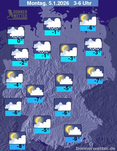 In der Nacht zum Montag ziehen im Norden wieder deutlich mehr und auch dichte Wolken durch, die hier einzelne Schneefälle bringen können. Über der Südhälfte ist es teils leicht, teils aber auch stark bewölkt, aber überwiegend trocken. Die Temperatur sinkt auf 0 Grad in Wilhelmshaven und bis -9 Grad in Augsburg.